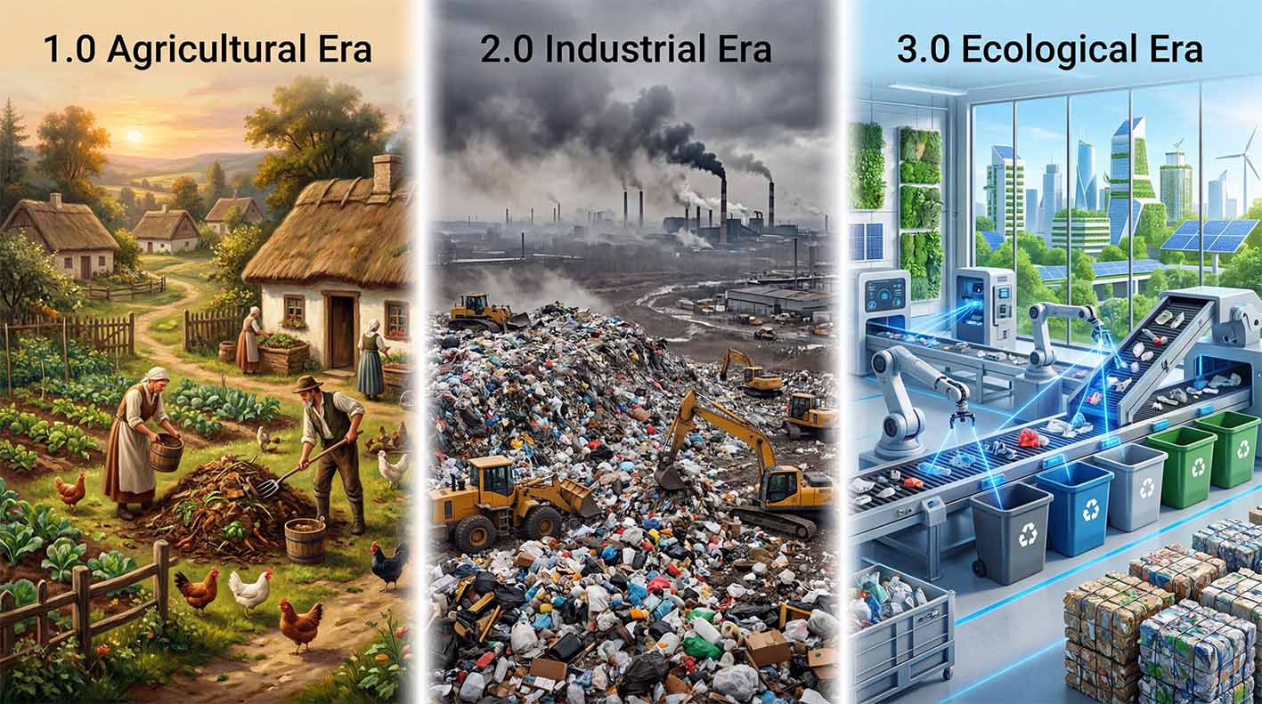 从历史演进看,混合生活垃圾处置模式经历了三次跨越:农耕文明时代以易降解有机质为主,自然消纳与简易堆肥是核心方式;工业文明时代城市化催生规模化处置需求,卫生填埋与焚烧发电成为主流,人类首次实现垃圾的规模化无害化处置;生态文明时代在全球可持续发展与循环经济目标驱动下,行业核心逻辑从“如何把垃圾处理掉”转向“如何让废弃物重新回归生产生活循环”,迈入以全链条资源化、智能化、循环化为特征的新阶段。